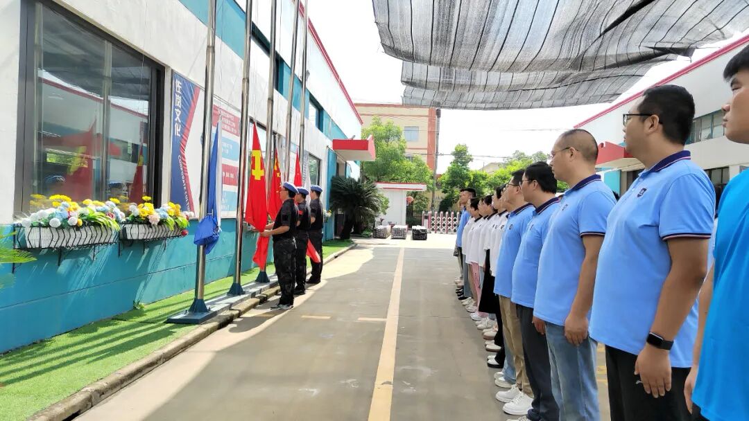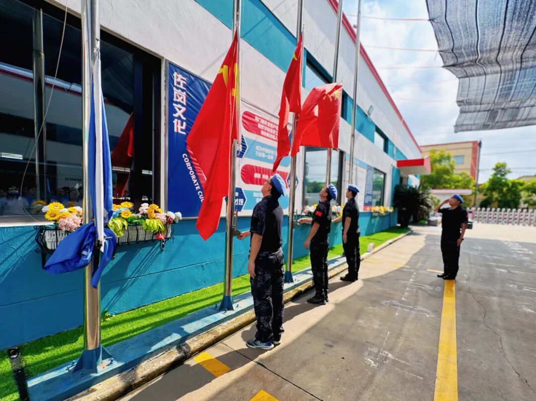 清晨的陽光灑滿廠區,佐嵐門窗全體成員整齊列隊,肅立注目。伴隨著雄壯的國歌聲,鮮艷的五星紅旗、迎風招展的黨旗與八一軍旗冉冉升起,迎風飄揚。這一刻,莊嚴與自豪在每個人心中激蕩,這不僅是對建軍98周年的深情禮贊,更是佐嵐人赤誠愛國情懷的集中表達。仰望迎風招展的旗幟,我們銘記歷史,致敬英雄,更堅定了實業報國、服務社會的初心使命。